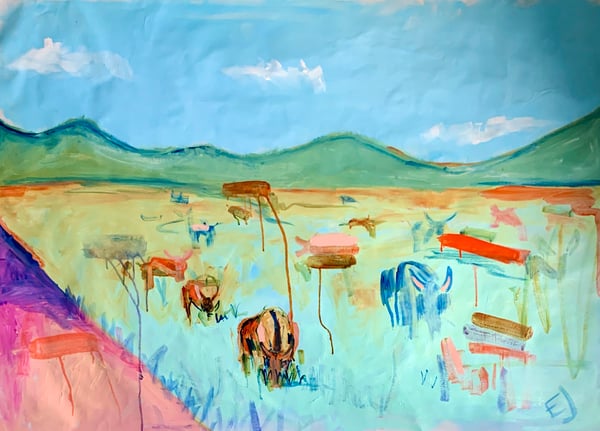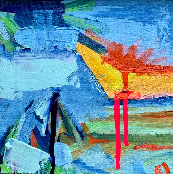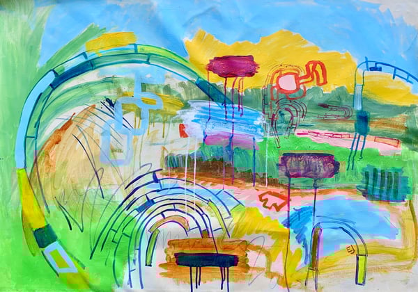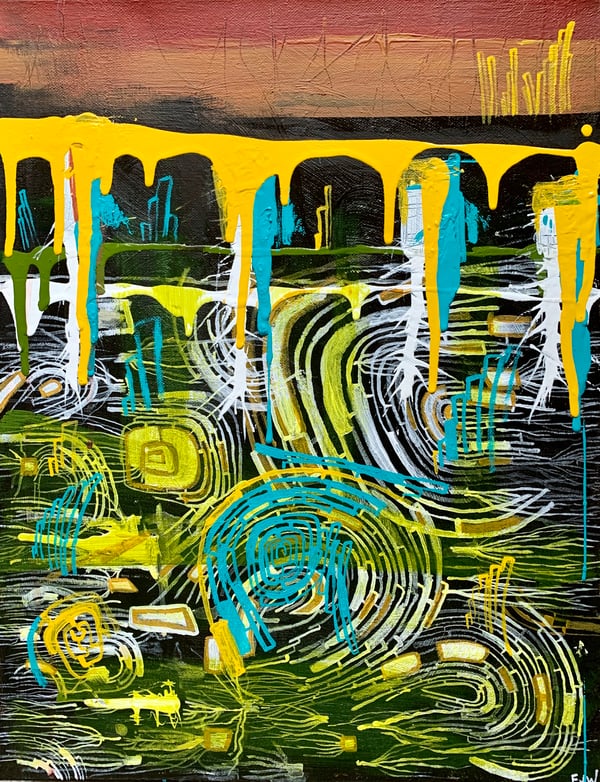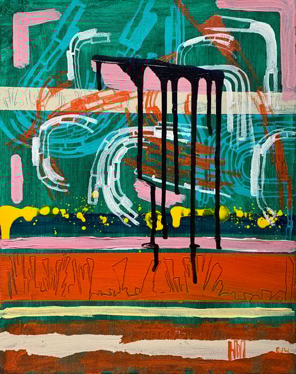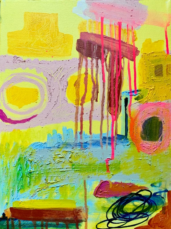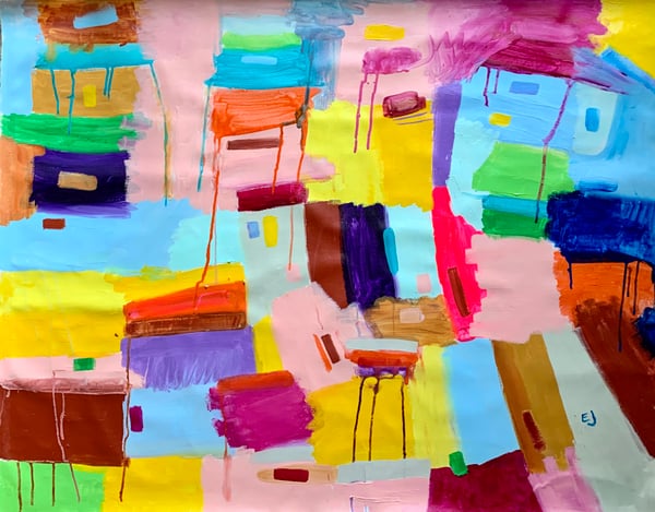 Acrylic/pencil/ crayon abstract painting on un-stretched canvas. The painting measures approximately 35” x 35” and will ship in a cardboard tube. It can hang loose on the wall for a more modern look or can be stretched /framed at a local frame shop to keep things classic.
